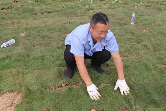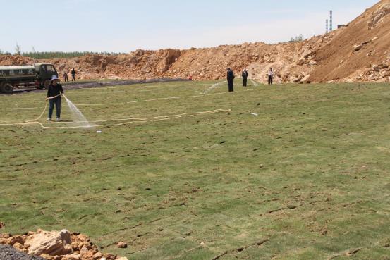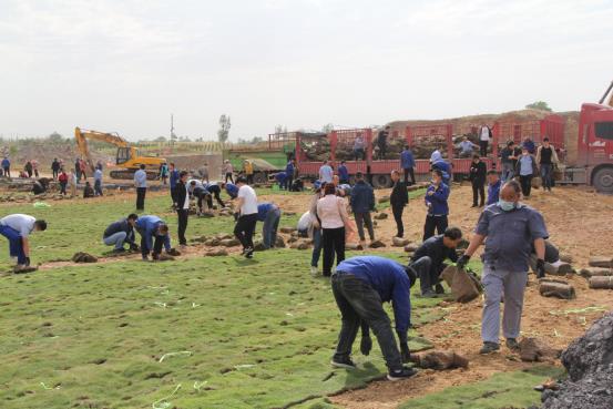 只見大家分工協作,認真地完成每一道工序。有的在平整土地、有的在鋪種草皮、有的在澆水,干的熱火朝天。在大家的共同努力下,當天袁店南礦山恢復治理區內15000余平方米的草坪鋪設鋪種完成,為礦山披上了綠衣。