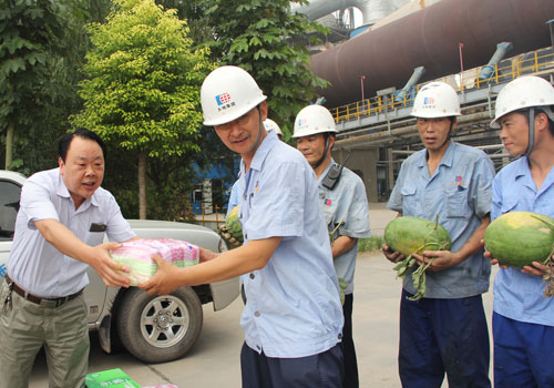 7月21日上午,縣總工會主席郭鵬飛帶領縣總工會部分工作人員到大地集團看望慰問一線職工,送去了礦泉水、綠茶、西瓜、毛巾等防署降溫用品,為廣大職工送去了夏日的清涼。圖為郭鵬飛主席親自為職工發放慰問品。