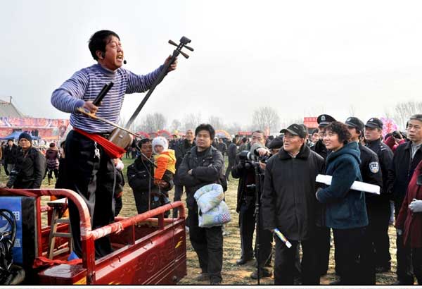 馬街書會,俗稱“正月十三馬街會”是一種漢族民間曲藝盛會。位于河南省寶豐縣城南5公里處馬街村,是全國各地說唱藝人的“朝拜圣地”。每年農(nóng)歷正月十三,全國數(shù)千名曲藝藝人負(fù)鼓攜琴匯聚于此。在初春的麥田里,他們以天作幕,以地為臺,以曲會友,亮?xí)①u書。京韻大鼓、山東琴書、三弦書等40多種曲藝曲種和上千部傳統(tǒng)及現(xiàn)代曲目在這里集中展現(xiàn),上演著一場聲勢浩大的曲藝盛會。