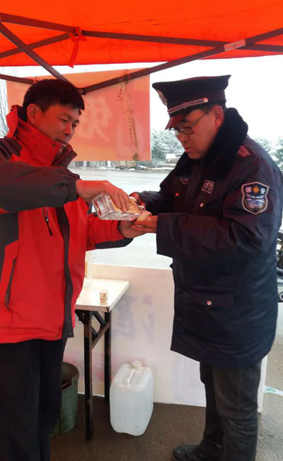 工作間隙,可敬的環衛老人放下手中的掃帚,喝杯富平春暖暖身
