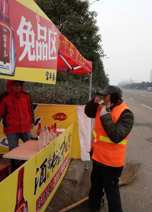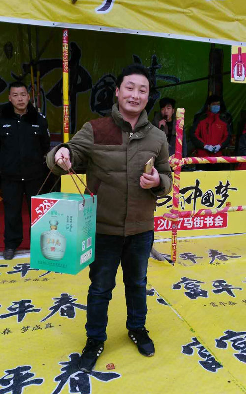 一位老人沉醉在品味美酒之中 同時,開展掃碼抽大獎活動,共設置七個獎項,最高獎項為價值528元富平春尊品原漿一壇,數萬份獎等你拿,綜合中獎率達98%。書會現場開展的系列活動不斷吸引著四面八方的來客蜂擁而來,掃碼的、抽獎的、品酒的,火爆場面嗨翻天;開展你有宴席我送禮活動,凡在馬街書會現場,預訂2017年宴席活動的,當場送價值528元尊品原漿1壇,并有豪禮相送,不斷為未婚青年送禮包,送驚喜,送實惠;開展停車送酒活動,為廣大趕會群眾提供停車點,每停一輛車送停車券一張,憑停車券可免費領取富平春F6一小瓶;開展金雞迎春買贈酬賓活動。凡在馬街書會期間,購買富平春華貴、F6、F3等酒品者,贈吉祥物金雞一個,恭祝金雞獻瑞,新年大吉!……