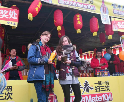 可愛瓶模惹得小朋友們歡欣不已 在劉蘭芳藝術(shù)館對面富平春宣傳主場地,更是人山人海,摩肩接踵,品酒的、掃碼的、領(lǐng)獎的,那火爆場面真是嗨翻了天,不時傳出主持人宣布中獎的消息,引來一波又一波的群眾圍觀,“哇塞!我中了一個黃金鍋,趕快發(fā)朋友圈”“富平春喝著真美”“富平春,我愛你”不時聽到現(xiàn)場朋友的歡呼聲。在趕會游玩的同時,隨便拿手機掃一下,就能中得實實在在的大獎,那是怎樣的一種心情、激動、高興、感恩……,怎一個“樂”字了得!