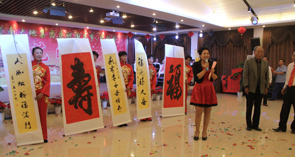 火紅的秧歌扭起來,歡快的舞蹈跳起來。2012年9月26日晚,大地集團“慶國慶,迎中秋”文藝晚會在大地公司會議室隆重舉行。 集團董事長張彪到會致辭,縣委宣傳部馬麗部長應邀到會場并發表了重要講話、縣總工會郭鵬飛主席等領導觀看了演出,公司領導、各部門代表及職工家屬共500多人觀看了演出。 晚會在婀娜多姿,喜氣洋洋的開場長綢扇舞《歡天喜地》中揭開序幕。“我和我的祖國一刻也不能分割,無論我走到哪里……”來自中控室的王亞旭、郭慧娟合唱的《我和我的祖國》,聲情并茂,催人奮進,在現場產生強烈共鳴,博得一陣陣熱烈的掌聲。《夫妻雙雙把家還》來自星空豫音社的單保民袁素玲,唱出美好生活的韻味,給人一種清新的感覺。更讓人難忘的是臺胞芮文正老先生也來到我們的晚會現場,親自執筆,現場書法,并賦詩詞,贈福贈壽,給大家帶來了無限的驚喜與歡樂……。這是一個激情奔放的夜晚,這是一個魅力四射的大地之夜!大地集團這支充滿活力的朝陽團隊,必將開創中國水泥行業的新天地。