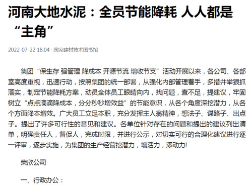 首頁 >> 新聞中心 >>媒體聚集 >> 河南大地水泥:全員節能降耗 人人都是“主角”